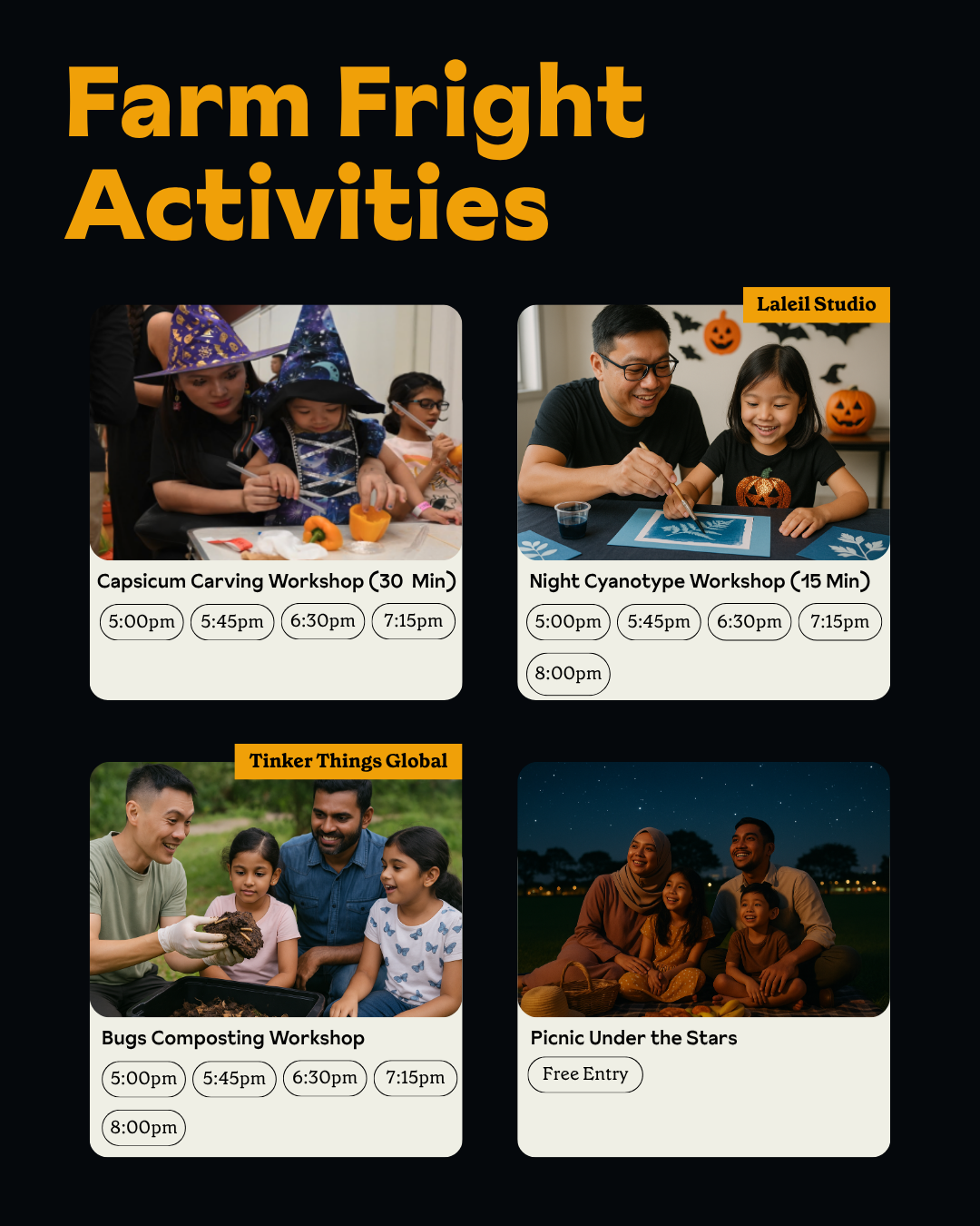 Get ready for a night of creative workshops and spine-tingling fun surrounded by the charm of our urban farm. From hands-on carving and bug explorations to relaxing picnics on the lawn, there’s something for everyone in the family!