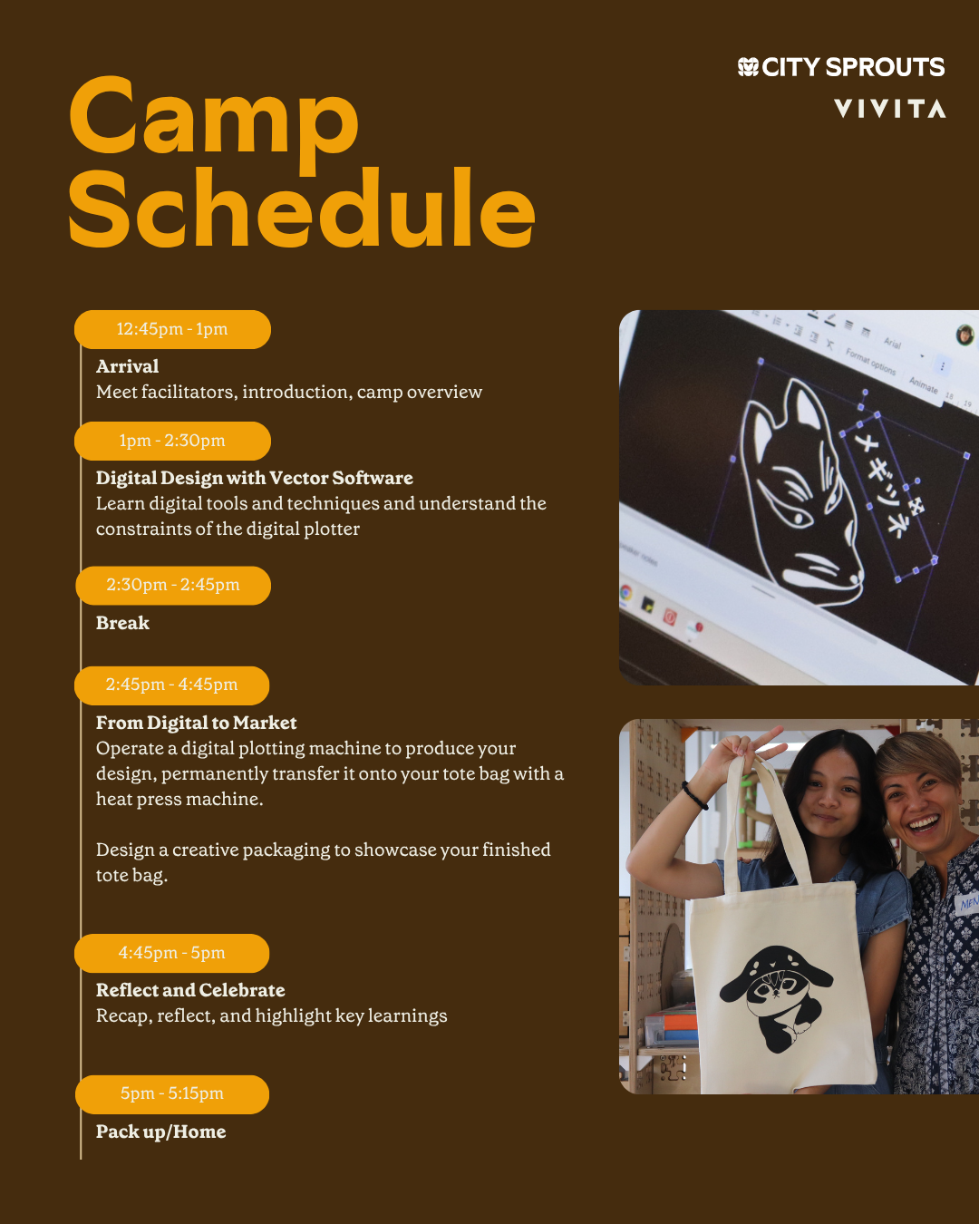 Through digital design and hands-on crafting, kids will gain the confidence to express their unique ideas. They’ll explore how to transform sketches into digital graphics and bring their vision to life on a custom tote bag. This experience nurtures self-expression and pride in their work.