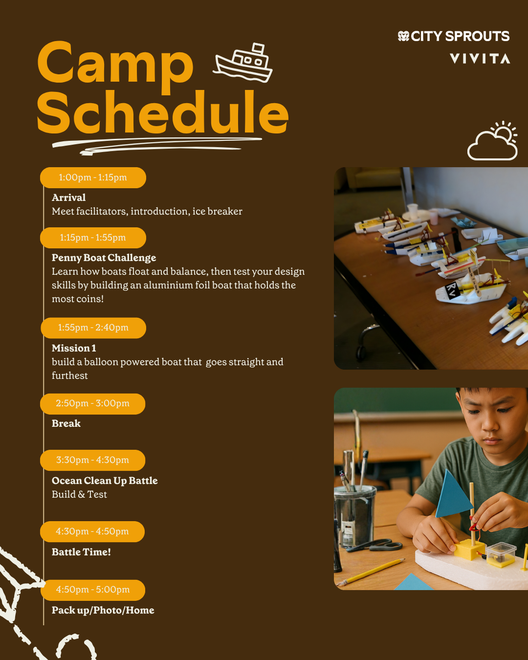 Kids will work together to brainstorm, sketch, and refine their ideas, gaining experience in creative problem-solving and collaboration. Through friendly boat-racing challenges, they’ll see how teamwork and experimentation help ideas evolve and improve.