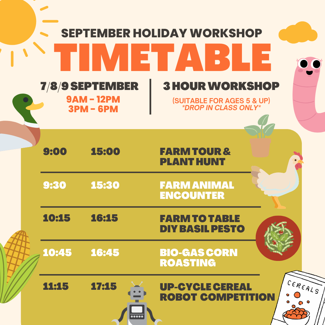 Schools out, time for the September Holidays!💫 Let your kids experience a fun-filled holiday at City Sprout's urban farm!🌱 We have many exciting activities lined up, from plant hunts, animal encounters, farm to table DIY basil pesto making and even a cereal robot competition!