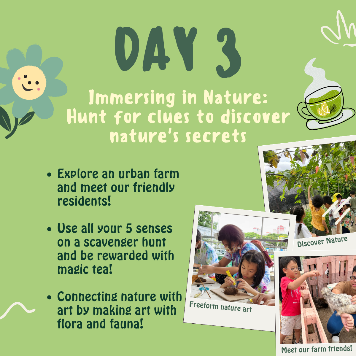 - Day 3: Participants will engage in a farm tour and scavenger hunt! Through an exciting magic tea activity and a hands-on craft workshop, children will be provided an immersive experience to promote appreciation for nature.